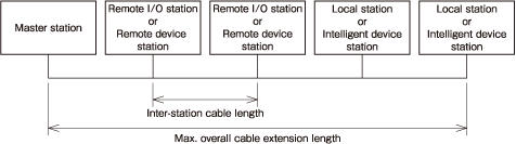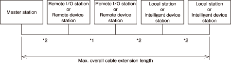 | 通信速度 | 最大干线长度 | T型分支间长度 | 远程I/O或远程设备站的站间长度*1 | 主站、本地站、智能设备站和相邻站之间的站间长度。*2 |